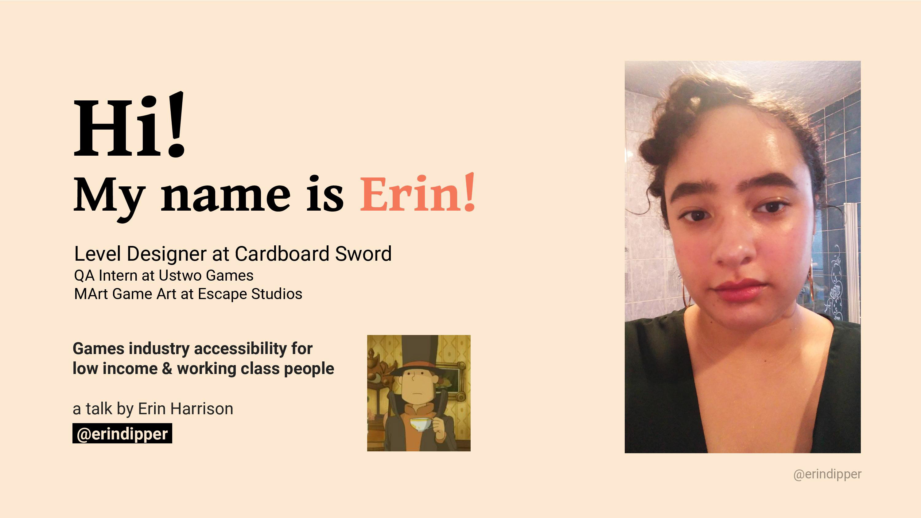 Hi - I'm Erin Louise, and I love environmental storytelling. For over five years, I have worked either as a level designer or generalist designer across mobile, PC, console and VR projects in the AAA and indie UK games industry, adapting to a new engine and toolkit with each new role. Currently, I'm working as a Level Designer on Zero Parades - For Dead Spies (2026) at ZA/UM Studio. Advocacy for low income and working class representation in games is hugely important to me, and I've been interviewed by People Make Games, BAFTA Guru, Games Anglia, Tentacle Zone and presented internally at Splash Damage on the topic! Additionally, I am an Escape Studios almuni with a MArt in Game Art, a BAFTA Connect Member, a BAFTA Game Awards Juror '21 & '22 & '24, a BAFTA YGD Awards Juror '21, and a huge lover of Professor Layton 🎩