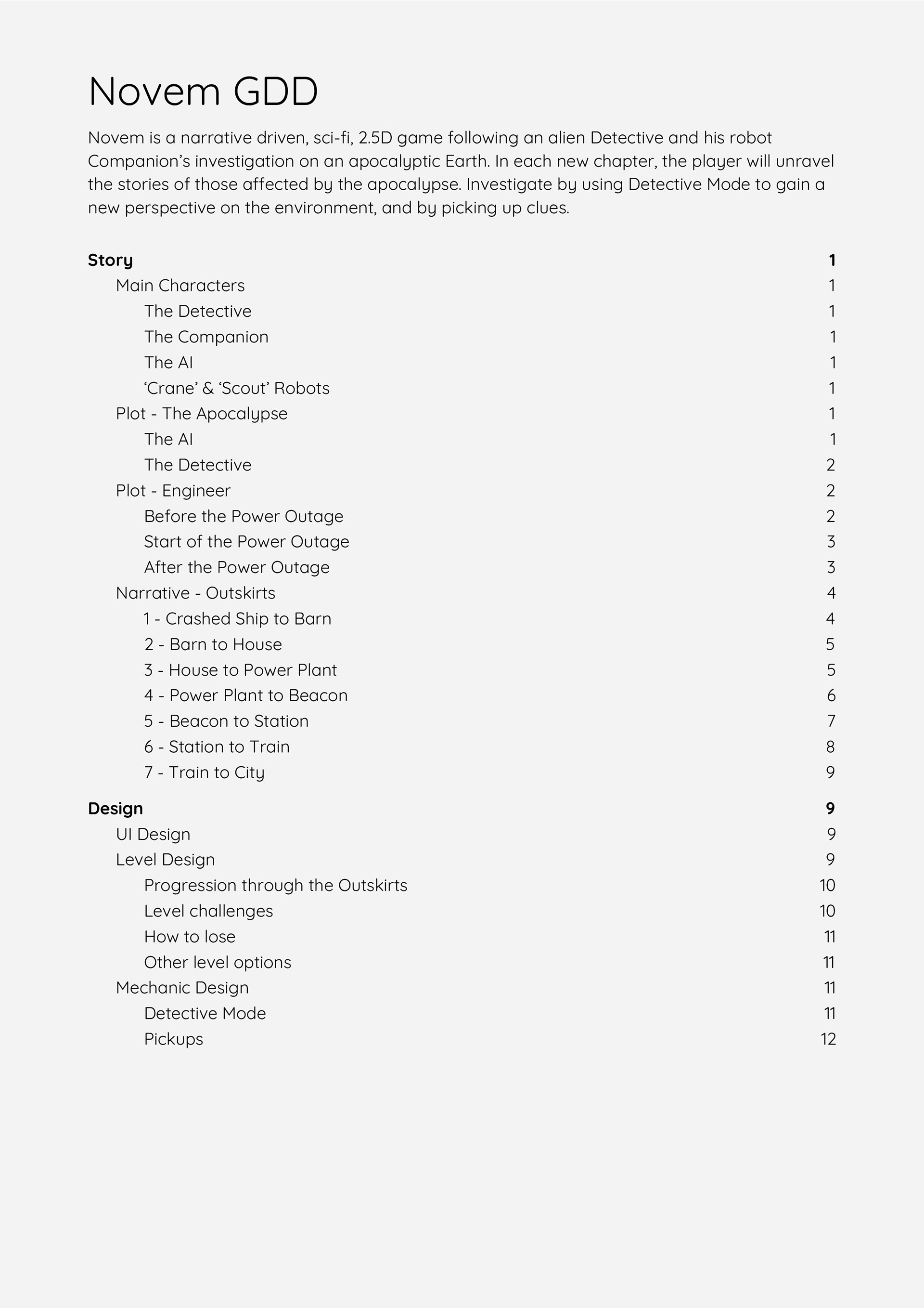 Early on in the project, I compiled a GDD to track the story, design and mechanic choices for Novem. Due to a lack of time post-COVID, we decided to cut a lot of the story and focus on developing aesthetics.