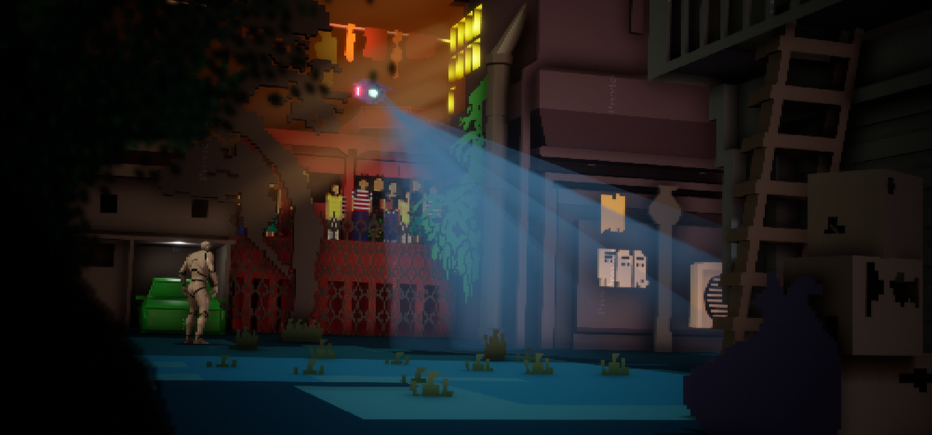 + I absolutely adore the lighting in the yellow windows with the orange god rays, as I matched the reference so closely! I also like how I modelled the exaggerated pixelated shapes such as as the white electrical boxes and the clothing on the washing line.