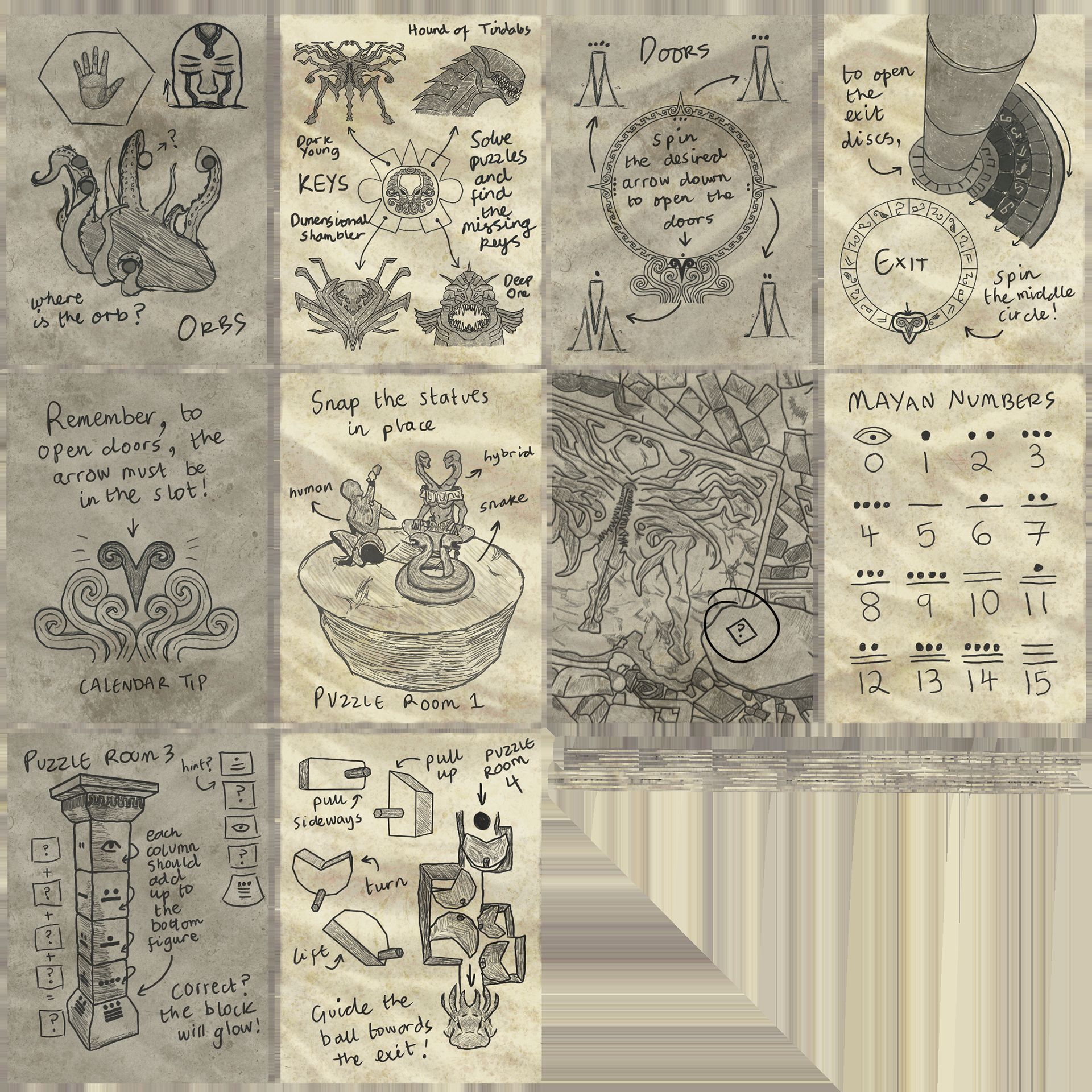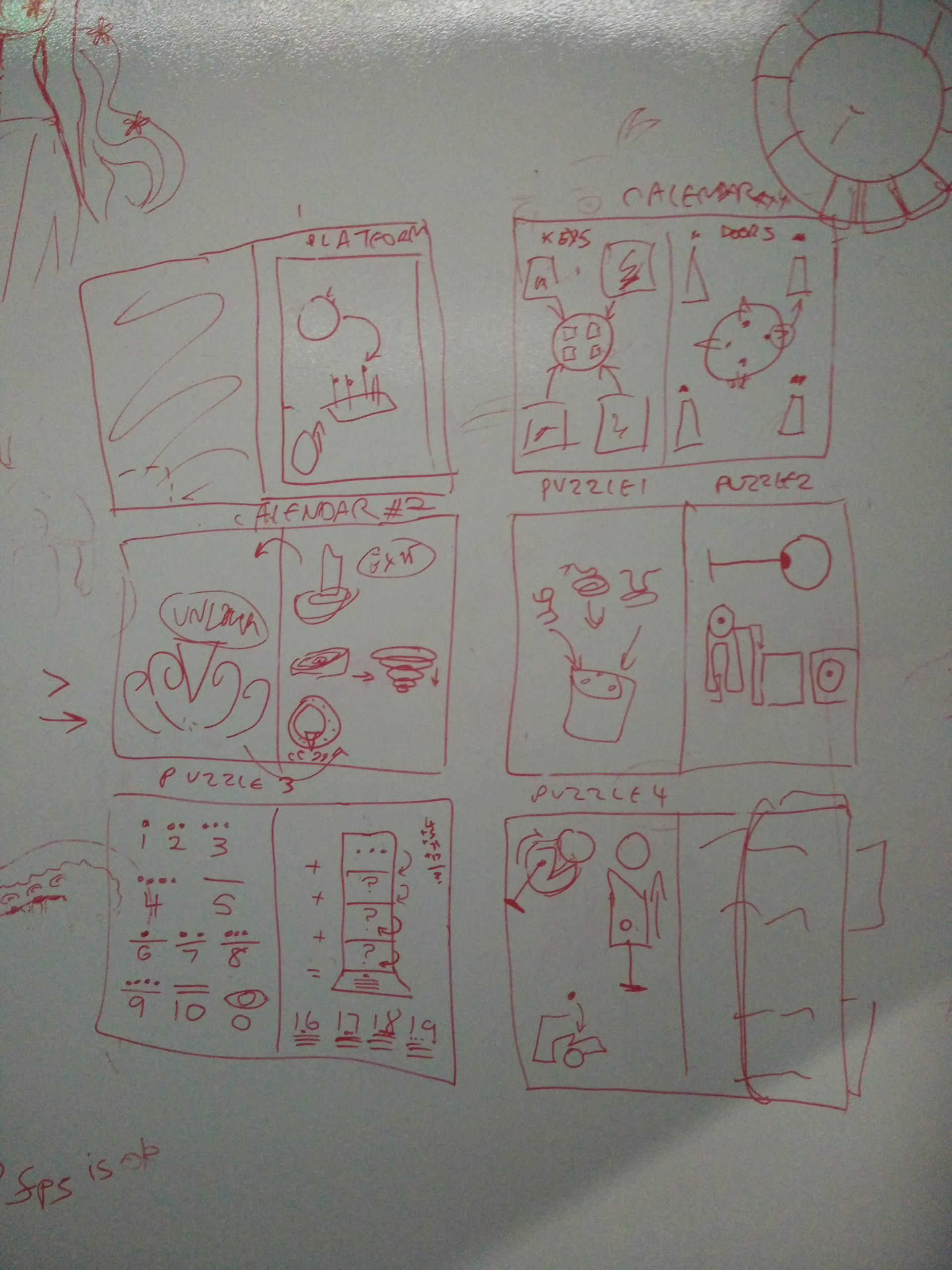 On a whiteboard, then in Photoshop, we planned the layout of the puzzle rooms and outlined how they would be ordered in the journal.